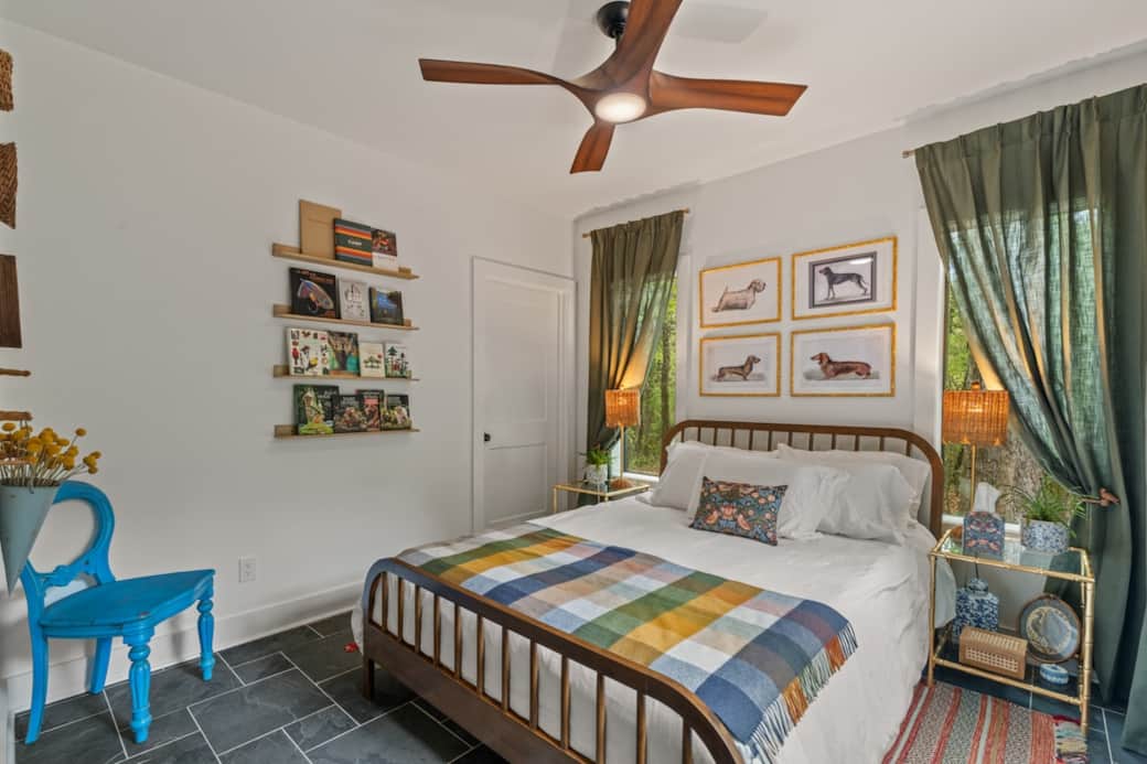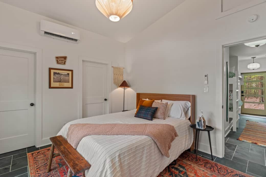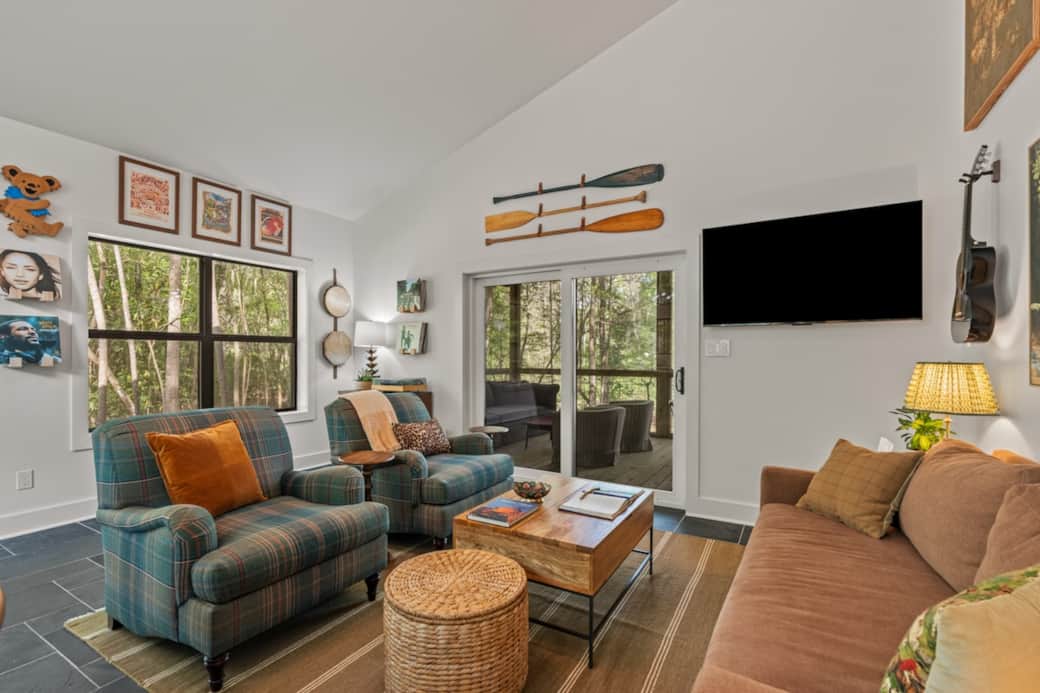 A layered mix of interesting, one-of-a-kind art and objects brings this gallery wall to life—each piece thoughtfully collected and inspired by the hosts’ love of thrifting, with subtle nods to nature, music, and the surrounding landscape.